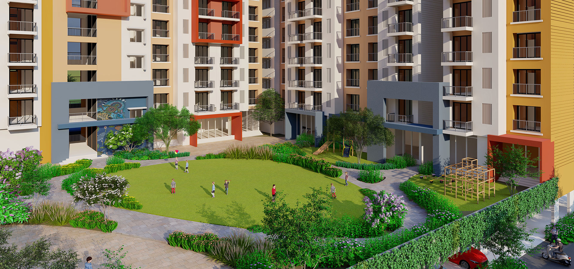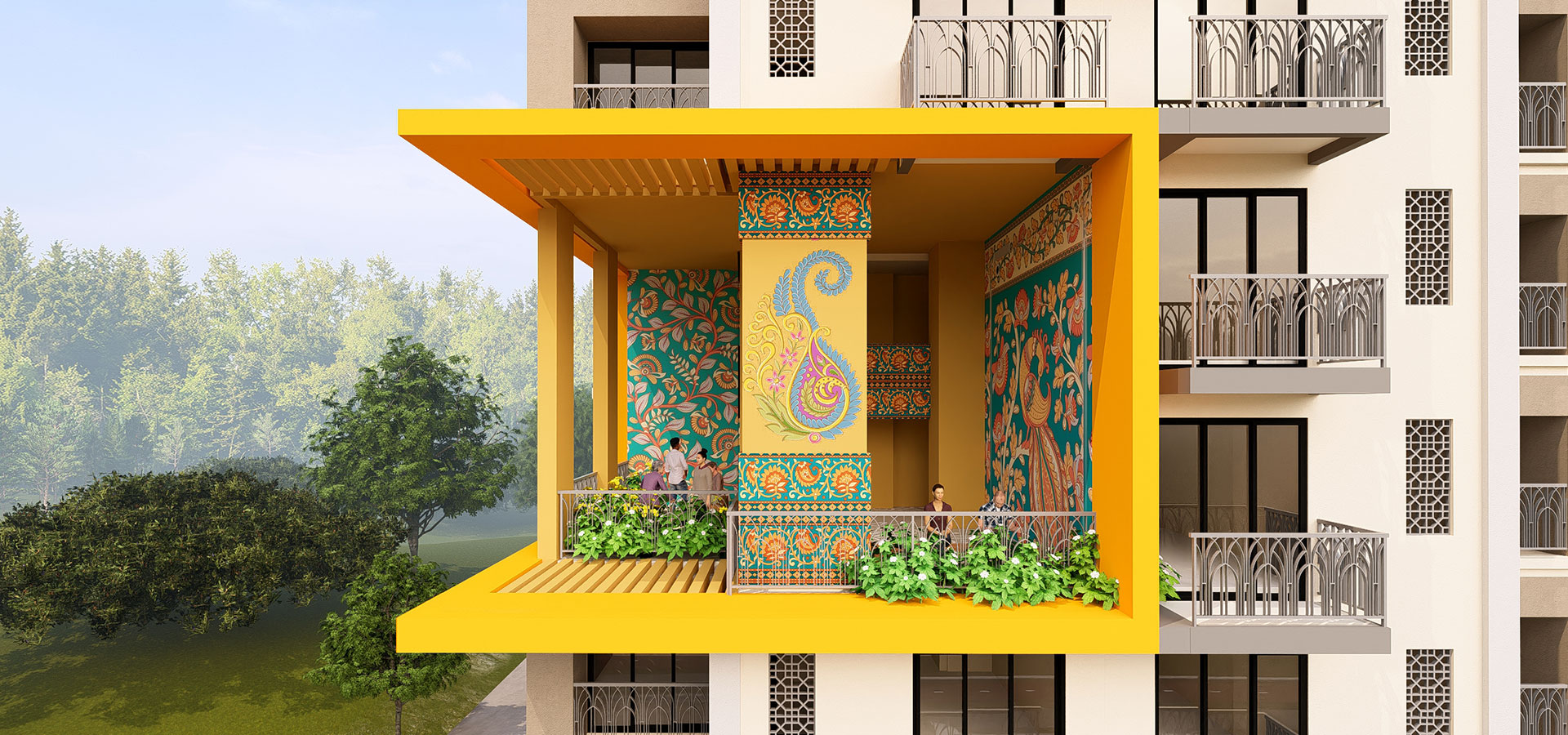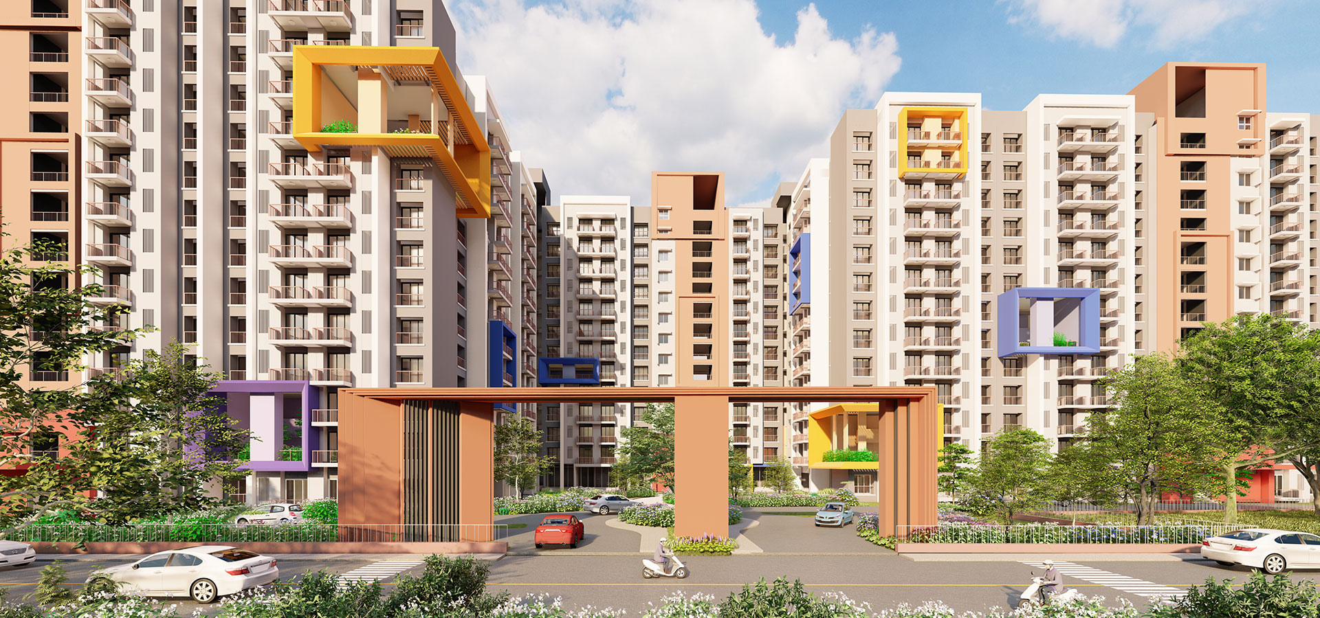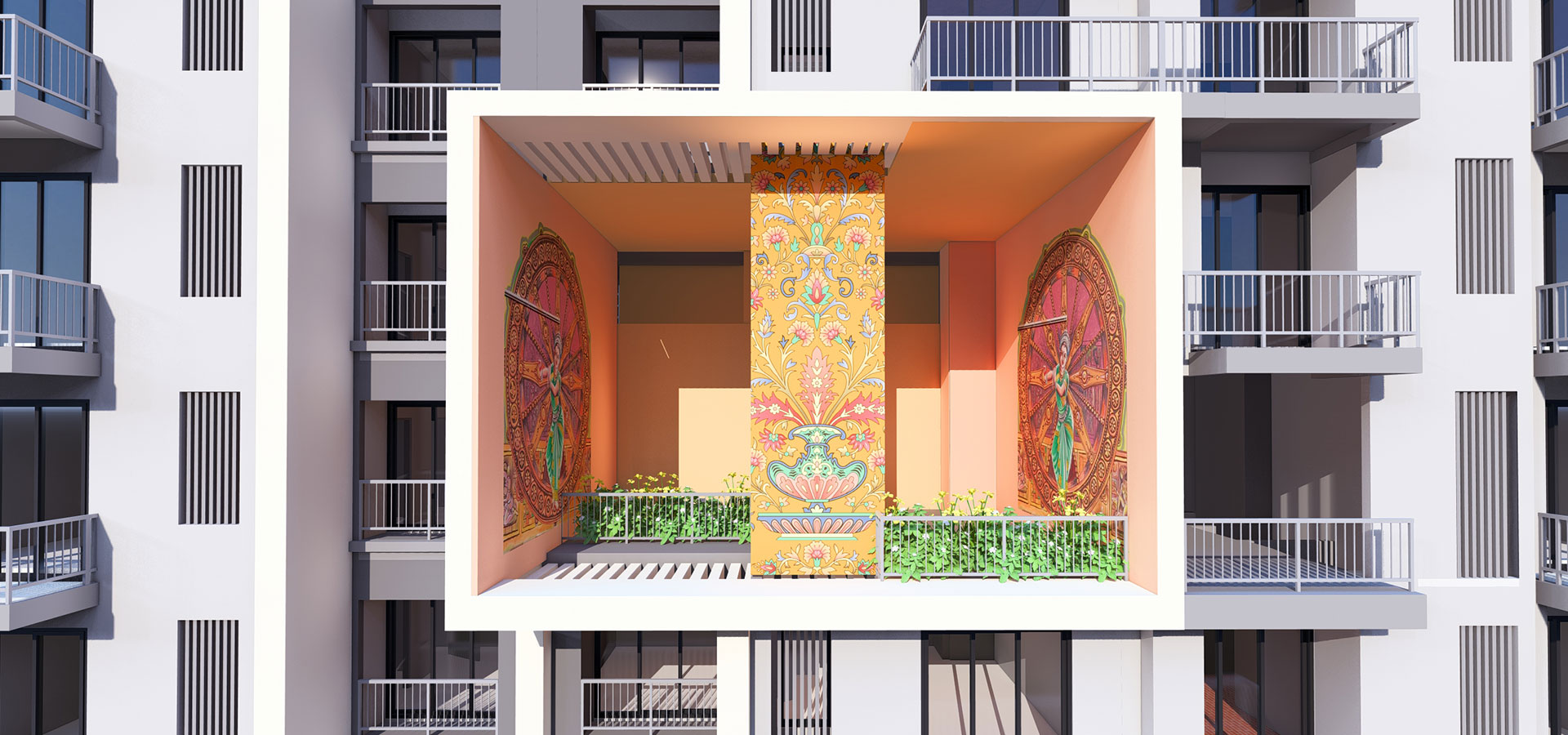 The architectural form is articulated through a system of strategically carved voids that enhance natural ventilation, introduce double-height community spaces, and break the monotony of large building masses. These voids act as social condensers and climatic devices, enabling cross-ventilation and ensuring shaded, comfortable shared spaces within the hot and humid coastal climate. Materiality and detailing draw from Odisha’s rich artistic heritage, translating textile patterns, colors, and craft traditions into a contemporary architectural language. Cultural references extend into murals and spatial interpretations of local art and dance, embedding identity within the built environment. Together with passive design strategies and a holistic approach to sustainability, the township offers a balanced model of livability, where environmental performance, cultural continuity, and modern aspirations are seamlessly integrated.