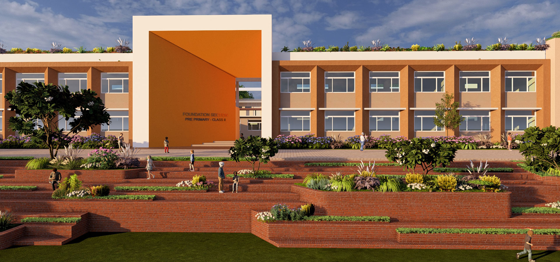 The learning environment is structured around multiple courtyards that evolve in scale and character from playful spaces for younger students to more formal courts for senior students, with the administrative courtyard at the center. Singly loaded corridors, north-facing classrooms, and climate-responsive facades enable ample daylight, cross-ventilation, and thermal comfort. Earth-toned exteriors and dense landscape buff ers respond to the dusty context while minimizing maintenance. Designed in compliance with CBSE and fi re safety norms, the project integrates passive design strategies, rainwater harvesting, and softscaped courtyards, with sustainability measures aligned toward achieving an IGBC rating.