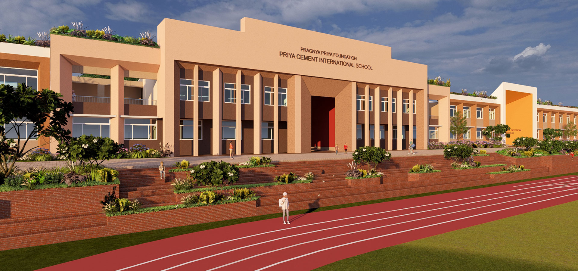 Priya Cement International School is a CSR initiative by Rain Cement Limited – Pragnya Priya Foundation, located in the rural setting of Ramapuram, Telangana. Planned on a 4-acre site adjacent to a cement plant, the campus is organized with a clear spatial hierarchy: a welcoming public front zone comprising sports facilities, social steps, and an amphitheatre, and a quieter academic zone positioned on higher southern ground. Entry from the north-east follows Vastu principles, while a linear, grid-based layout ensures cost effi ciency, fl exibility, and a strong visual presence from the approach road. Academic spaces are arranged by age groups and connected through a central administrative spine, with service zones along the southern edge acting as a visual and dust buff er from the factory.